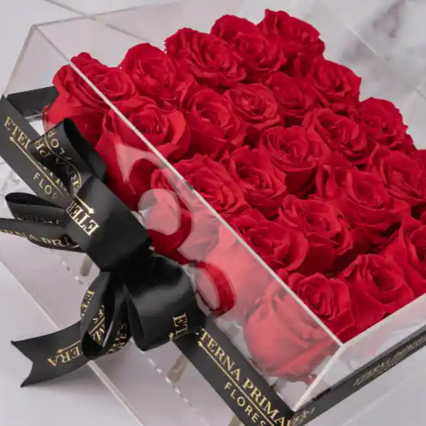 Sofisticado arreglo de rosas preservadas que representa pasión, amor y elegancia. Su presentación en una caja acrílica transparente, complementada con un lazo negro premium, resalta el carácter exclusivo del diseño y permite apreciar cada detalle de las rosas.