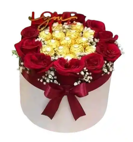 Un lujoso arreglo que combina la elegancia de las rosas rojas con la dulzura de exquisitos bombones Ferrero Rocher, dispuestos en una fina caja redonda decorada con lazo satinado color vino. Un detalle perfecto para sorprender y conquistar, ideal para aniversarios, San Valentín o cualquier ocasión donde el amor sea el protagonista.