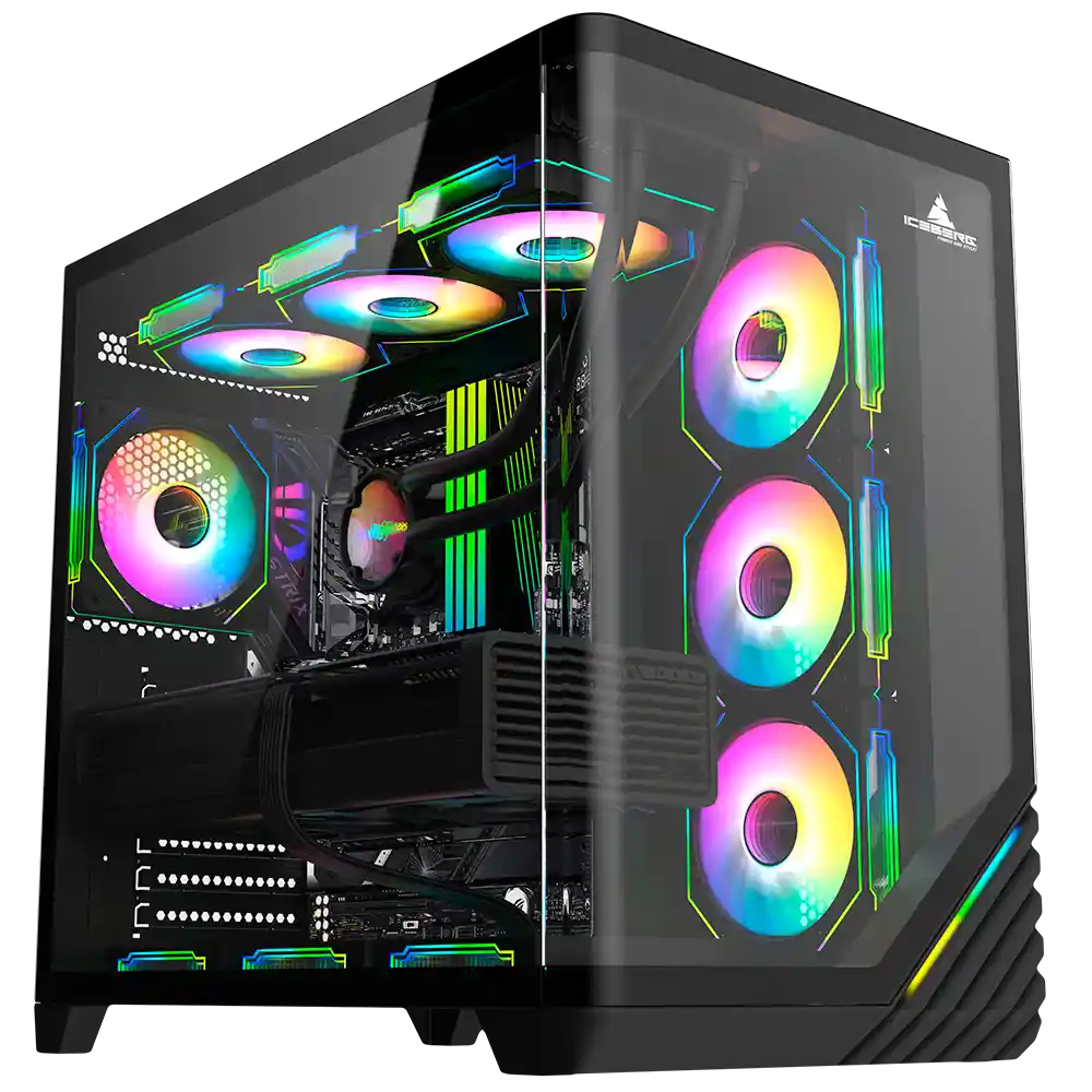 Panel frontal en vidrio curvo con tira LED — Diseño premium de alto impacto visual que permite exhibir los componentes internos de forma llamativa. Amplia compatibilidad de placas y componentes — Soporta placas ATX, Micro-ATX y Mini-ITX, tarjetas gráficas de hasta 410 mm y disipadores de CPU de hasta 160 mm de altura. 7 ventiladores ARGB tipo Infinity incluidos — Vienen con hub controlador integrado para gestionar el flujo de aire y la iluminación fácilmente. Soporte para refrigeración líquida de hasta 360 mm — Ideal para builds de alto rendimiento que requieren cooling avanzado. Conectividad frontal completa — Incluye USB Tipo C, USB 3.0, USB 2.0 y audio HD, además de espacio para 1 SSD de 2.5" y 1 HDD de 3.5".