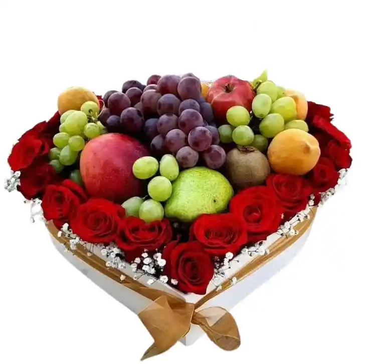 Caja de corazón con rosas y frutas Una innovadora combinación de 12 rosas frescas con frutas selectas en una caja en forma de corazón, ideal para sorprender con un detalle lleno de frescura y sabor. Nota: La flor puede ser sustituida dependiendo de la disponibilidad de color y del producto. "Mensaje Personalizado" máximo de 30 caracteres (Dejar el mensaje en el chat, los comentarios no se previsualizan para la tienda, por lo que si se dejan allí no podrá ser incluido).