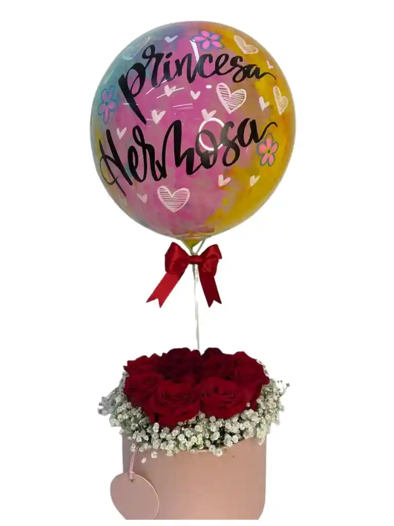 Caja cilíndrica con flores frescas, gypsophila y globo decorativo. Un detalle alegre y especial para cualquier ocasión.