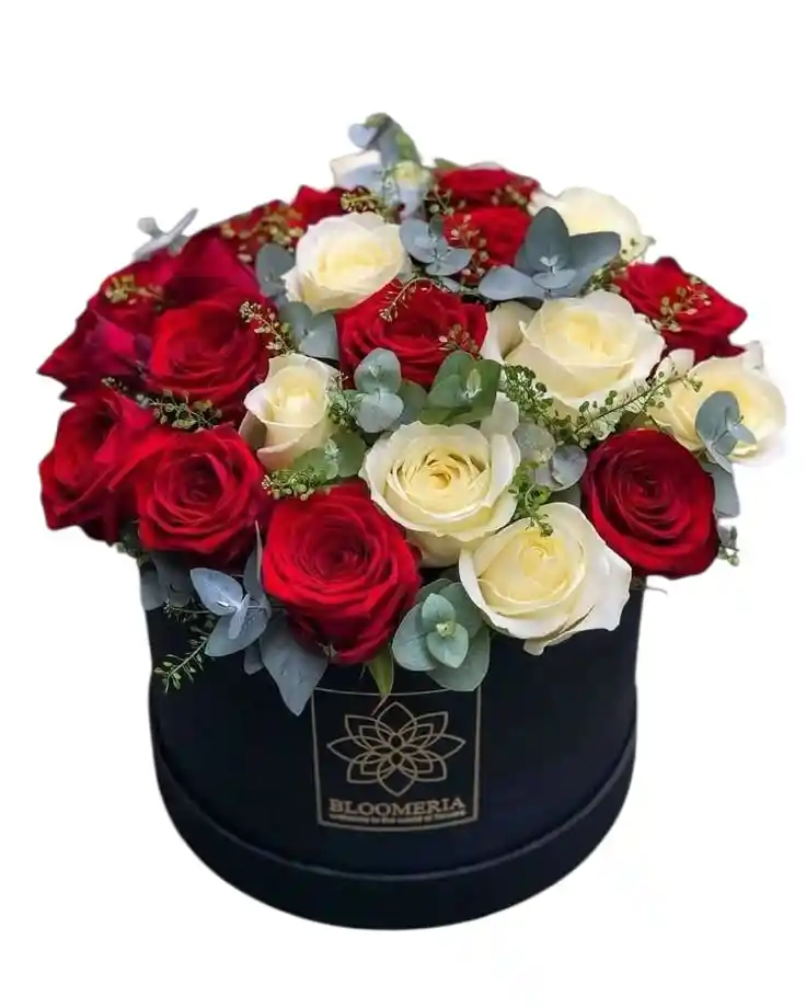 es una pieza de alta floristería que redefine el romance con un toque de sobriedad y distinción. El arreglo se presenta en una exclusiva caja cilíndrica de terciopelo negro, cuya textura profunda resalta la frescura de los elementos naturales. En su interior, una danza de rosas rojas premium y rosas blancas marfil se entrelazan de forma orgánica, simbolizando la unidad y la pureza de un sentimiento compartido.