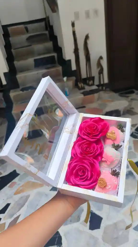 Caja con rosas y 3 deliciosas fresas achocolatadas+3 rosas eternas.