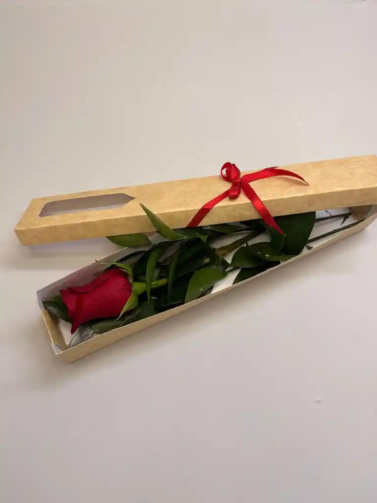 Caja de cartón con una rosa roja y rusco