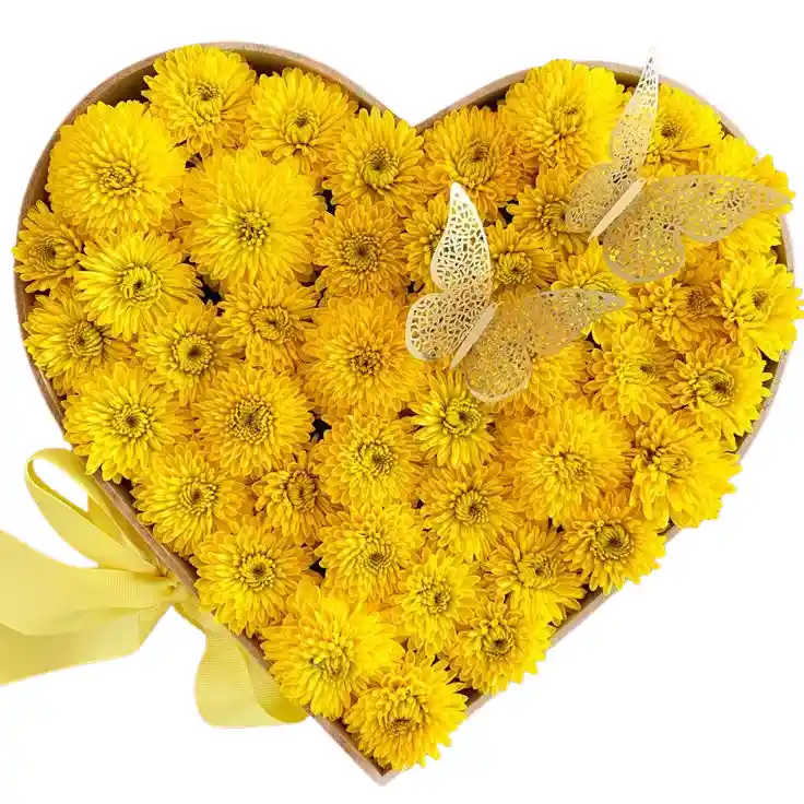 Caja en forma de corazon de crisantemos amarillos. La flor puede ser sustituida dependiendo la disponibilidad de color y del producto “Mensaje Personalizado” máximo de 30 caracteres (Dejar el mensaje en el chat, los comentarios no se previsualizan para la tienda por lo que si se dejan allí no podrá ser incluido).