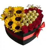 Caja en forma de corazón con 9 rosas, 6 girasoles y 18 chocolates con una mariposa Nota: La flor puede ser sustituida dependiendo la disponibilidad de color y del producto “Mensaje Personalizado” máximo de 30 caracteres (Dejar el mensaje en el chat, los comentarios no se previsualizan para la tienda por lo que si se dejan allí no podrá ser incluido).