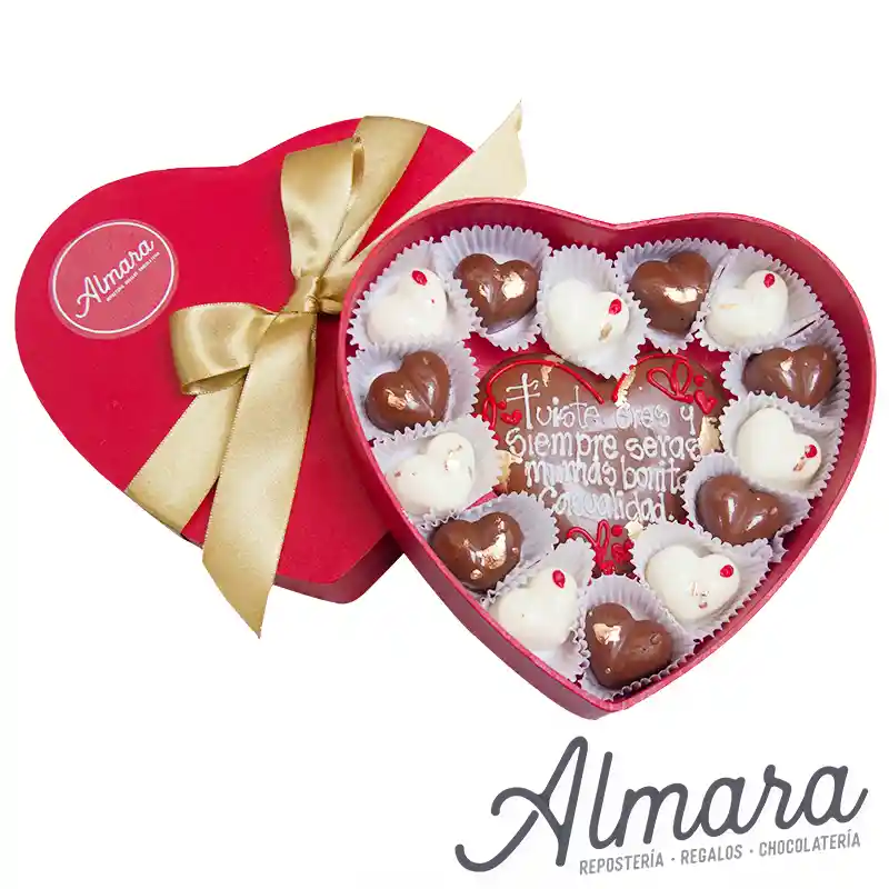 Regalos y detalles románticos Caja de regalo en forma de corazón rojo 14 bombones de chocolate blanco y semi amargo rellenos de frutos secos 1 corazon de chocolate semy amargo con mensaje "Fuiste, eres y serás mi mas bonita casualidad" Almara,desayunos, perdón, sorpresas, cerveza, chocolates