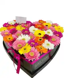 Caja en forma de corazón de 40 gérberas surtidas Nota: La flor puede ser sustituida dependiendo la disponibilidad de color y del producto “Mensaje Personalizado” máximo de 30 caracteres (Dejar el mensaje en el chat, los comentarios no se previsualizan para la tienda por lo que si se dejan allí no podrá ser incluido).