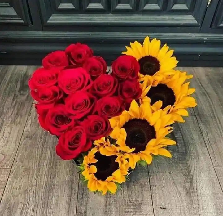 Incluye: girasol x4, rosas x 15, caja en forma de corazon, decoracion, mensaje personalizado