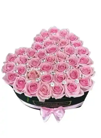 Arreglo de lujo en caja con forma de corazón (base negra con lazo rosa) rellena de rosas rosadas premium dispuestas en domo y acentos decorativos tipo cristal/brillos (según disponibilidad), con follaje sutil. Detalle romántico e impactante para aniversario, San Valentín o sorpresa especial. Elaborado en espuma floral hidratada. Incluye tarjeta dedicatoria y entrega rápida el mismo día.
