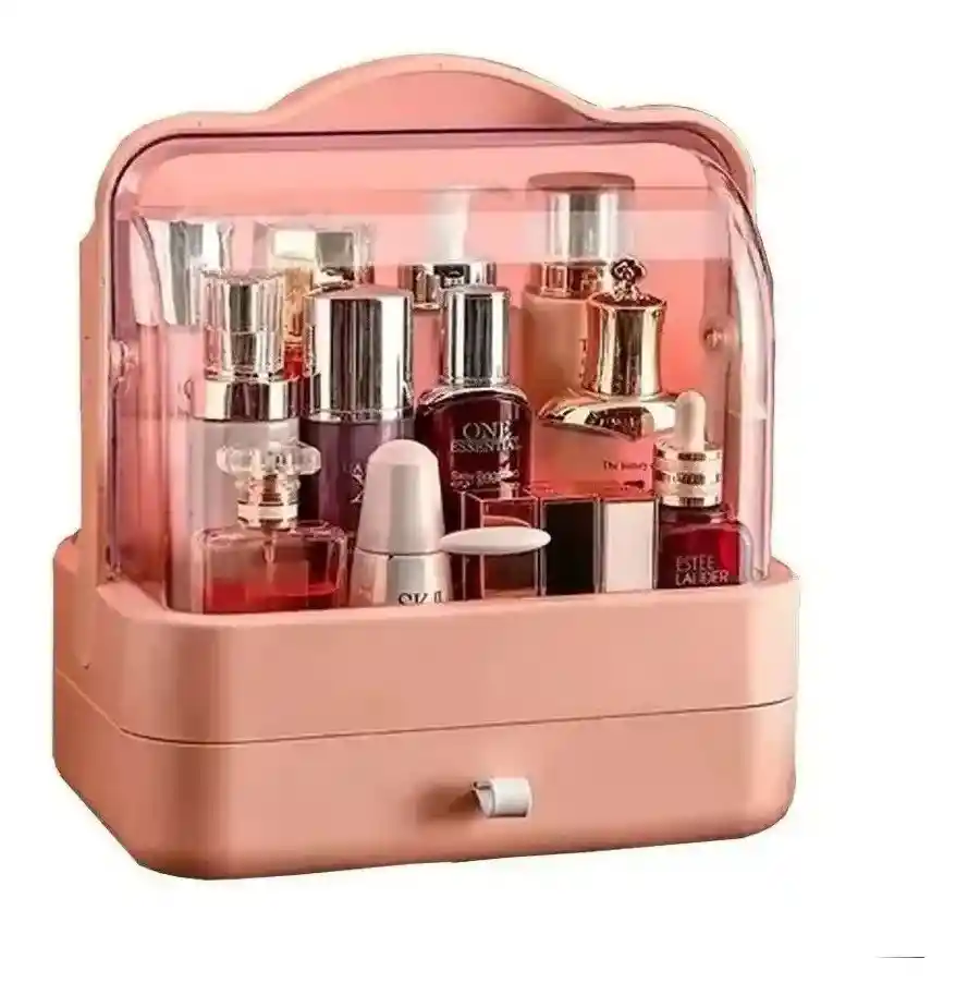 Diseño a prueba de polvo e impermeable que protege los productos del deterioro. Cuenta con un compartimento superior transparente tipo exhibidor para lociones y perfumes, y un cajón inferior para artículos más pequeños. Incluye una manija para facilitar su transporte. Ideal para organizar maquillaje, productos para el cuidado de la piel (skincare), joyas y accesorios en el tocador o escritorio. Disponible en varios colores, incluyendo el rosa que se muestra en la imagen.