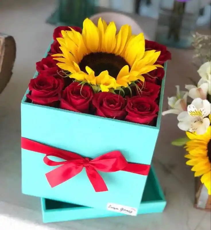 Inlcuye: girasol x1, rosas en forma cuadrada, caja cuadrada (varia segun disponibilidad), decoracion, mensaje personalizado