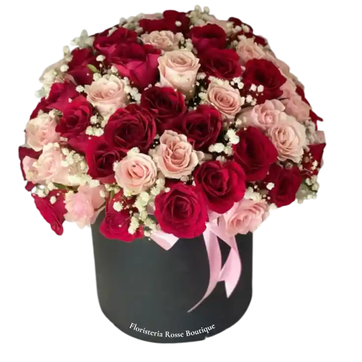 Impresionante caja floral con 40 rosas combinadas en tonos rojos y rosados, cuidadosamente organizadas para crear un arreglo elegante, romántico y lleno de impacto visual. Perfecta para aniversarios, propuestas o celebraciones inolvidables.