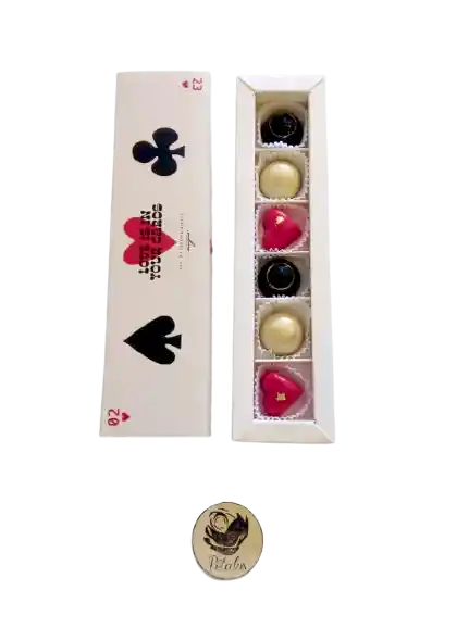 Caja de 6 chocolates pintados a mano y decorados con laminilla de oro de 24K. Su sabores son: Chocolate blanco con macadamias caramelizadas, fresas y uchuvas liofilizadas, chocolate semi oscuro con relleno de vainilla, chocolate semi oscuro con s'mores (caramelo, galleta y masmelo). Incluye tarjeta para escribir un mensaje.
