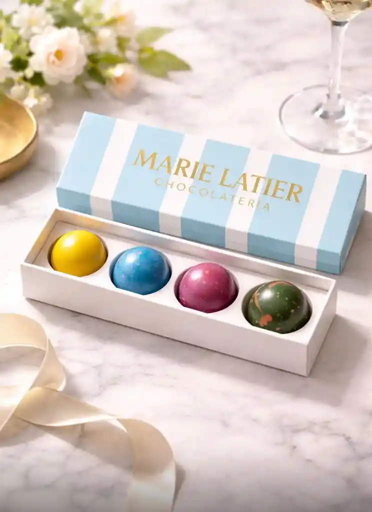 Deliciosa caja de bombones rellenos x 4 unidades al 85 % de cacao.