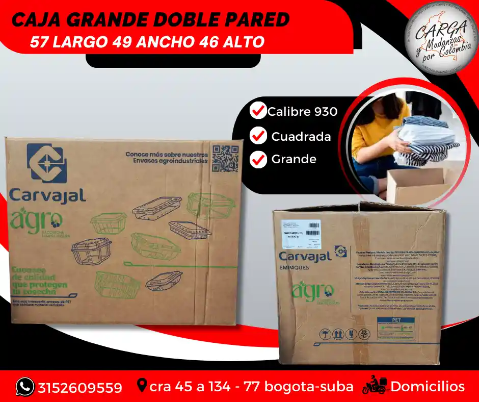 Las cajas de cartón en embalaje sirven para proteger los productos durante el transporte y almacenamiento, garantizando que lleguen en buen estado a su destino final. - Su ligereza disminuye los costos de envío y facilita la manipulación. - Protege de posibles daños a su contenido por las vibraciones en medio del transporte. - Permiten una clasificación y organización eficiente de los productos, especialmente en el caso de las mudanzas. Medidas: 57 largo x 49 ancho x 47 alto Alta Calidad - Producto Garantizado. Visítanos: Cr. 45a # 134 - 77 Local Esquina Contáctanos: 315 2609 559 *ASESORIA SIN COSTO POR WHATSAAP*