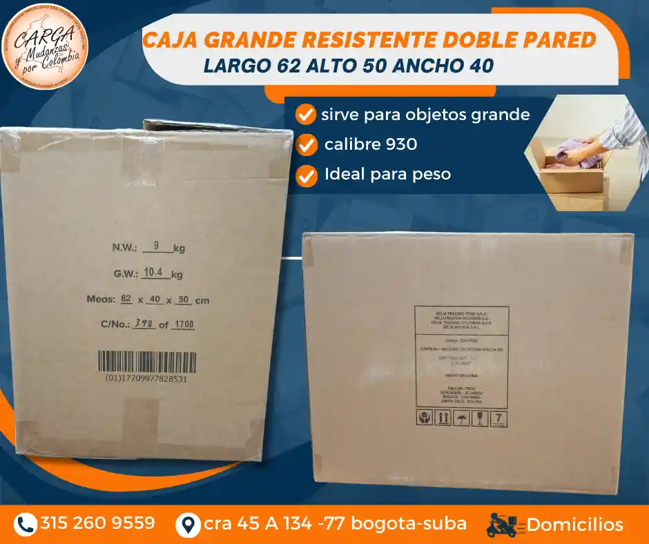 caja doble pared resistente Medidas: 62 largo x 40 ancho x 50 alto Alta Calidad - Producto Garantizado. Visítanos: Cr. 45a # 134 - 77 Local Esquina Contáctanos: 315 2609 559 *ASESORIA SIN COSTO POR WHATSAAP*