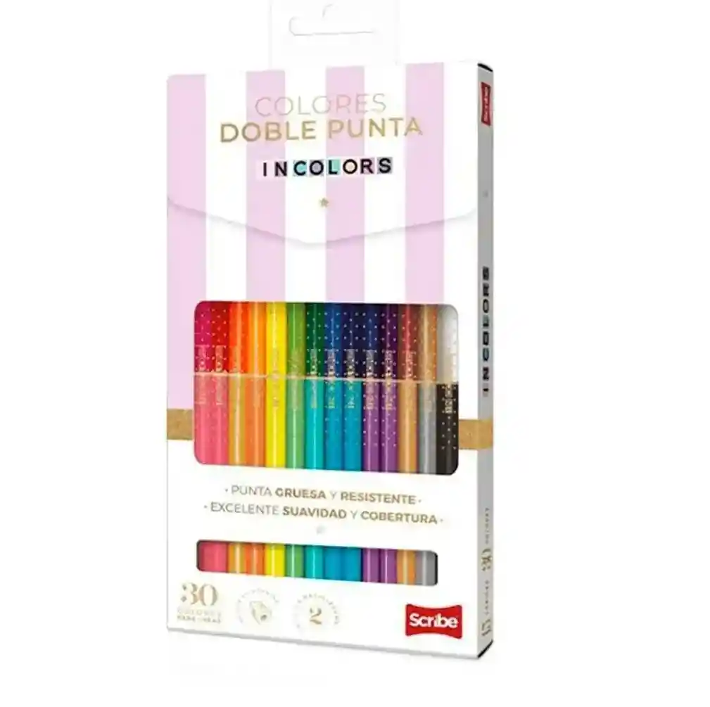 Colorea con estilo y suavidad !! Nuevos !! colores InColors Scribe 30 Colores / 15 Lapices Doble Punta Cierre Magico Incluye Sacapuntas Punta gruesa y resistente Excelente suavidad y cobertura No toxico Medidas: 23 cm x 17 cm en empaque