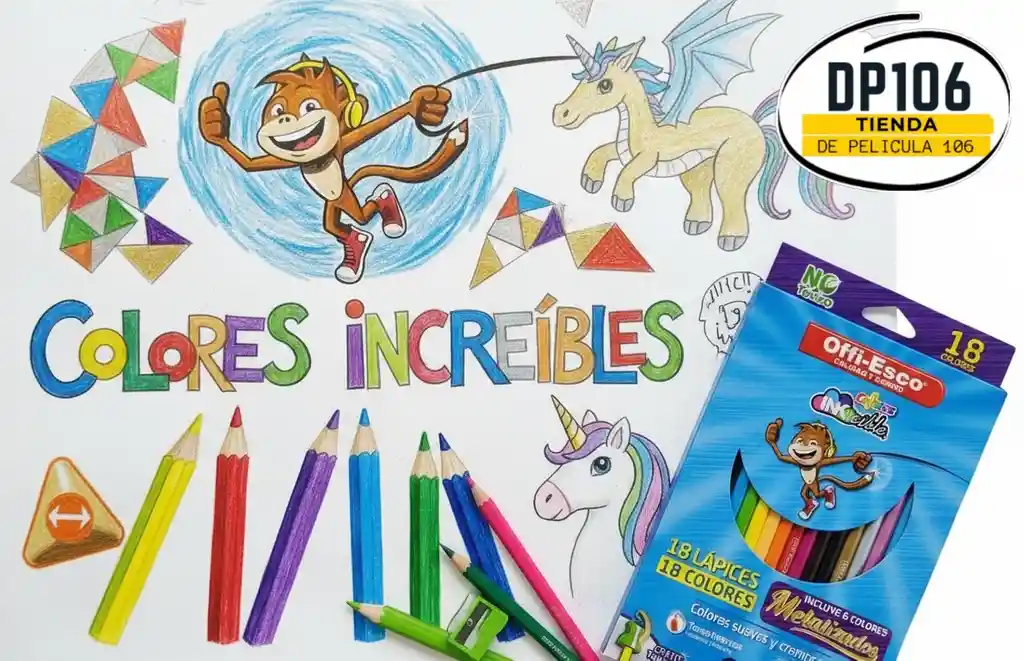 Colores Offi Esco x18 Unidades - Incluye 6 Colores Metalizados *Colores suaves y cremosos* Tonos intensos llamativos y brillantes -Azul -Rojo -Cafe -Azul Claro -Amarillo -Piel -Verde -Verde Limon -Morado -Naranja -Magenta -Negro -Dorado -Plateado -Cafe Metalizado -Azul Metalizado -Purpura Metalizado -Verde Metalizado