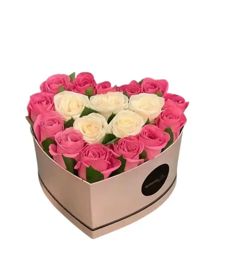 es una pieza delicada y sofisticada, diseñada para expresar los sentimientos más tiernos con un estilo impecable. El arreglo se presenta en una caja artesanal en forma de corazón en tono rosa pálido, que alberga una armoniosa combinación de rosas en color rosa vibrante y blanco níveo, dispuestas de manera que las flores blancas forman un corazón interno que resalta la elegancia del conjunto.