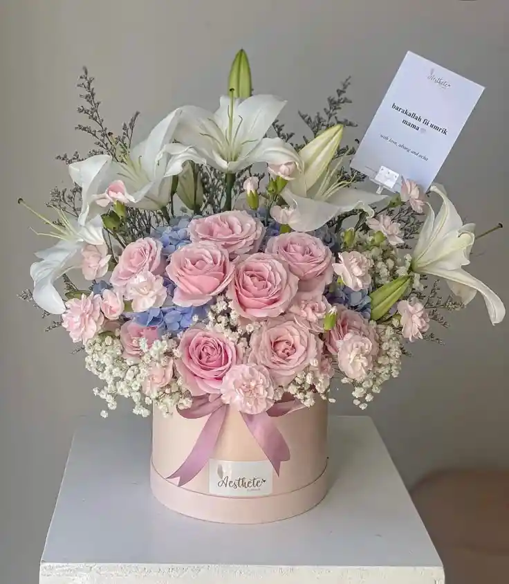 Un arreglo celestial donde la pureza de los lirios blancos se funde con la dulzura de las rosas rosadas, realzadas por hortensias azules, claveles mini y el delicado resplandor del gypsophila. Presentado en una elegante caja con listón rosa, este diseño transmite serenidad, amor y gratitud. Perfecto para celebraciones especiales, aniversarios o como un gesto de admiración y cariño profundo.