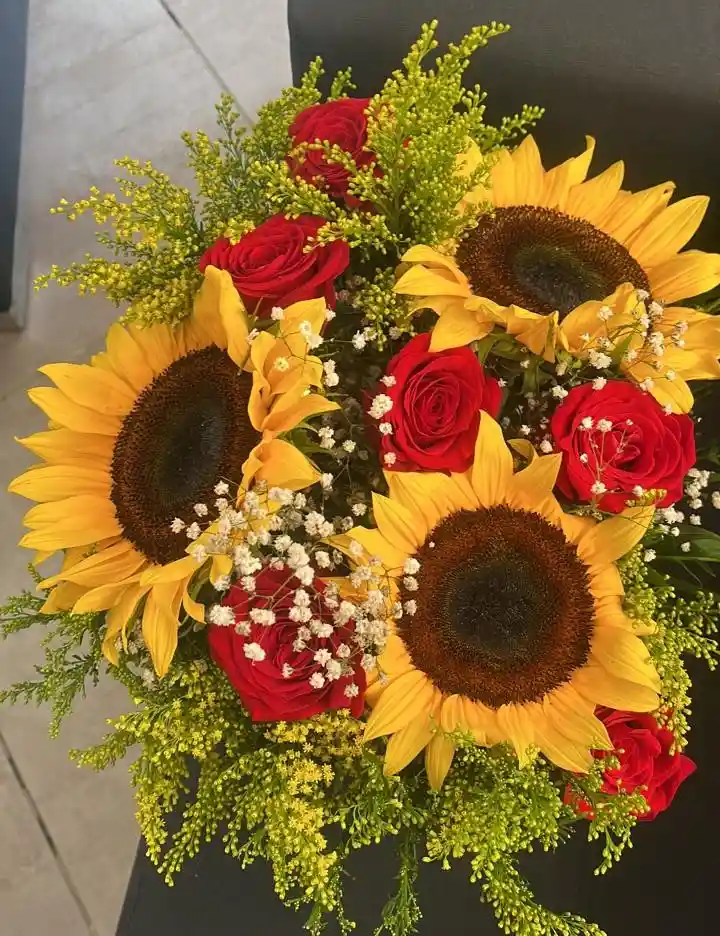 Contiene: girasoles x3, rosa roja x6, solidago, rusco, yitzofilia, caja de madera, decoración y mensaje personalizado