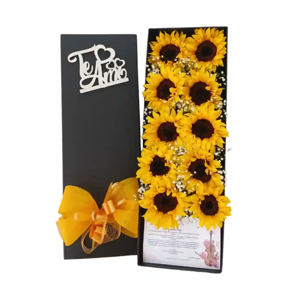 Hermoso arreglo floral en caja grande con tapa, de girasoles. Perfecto para toda ocasión. Pin según ocasión ("Te Amo", "Te Quiero", "Feliz Cumpleaños", "Feliz Día", "Feliz aniversario"), puedes contactarte para personalizarlo.