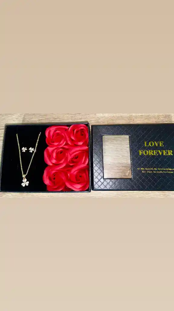 Caja De Lujo, Con Rosas Artificiales, Cadena En Rodio Con Aretes