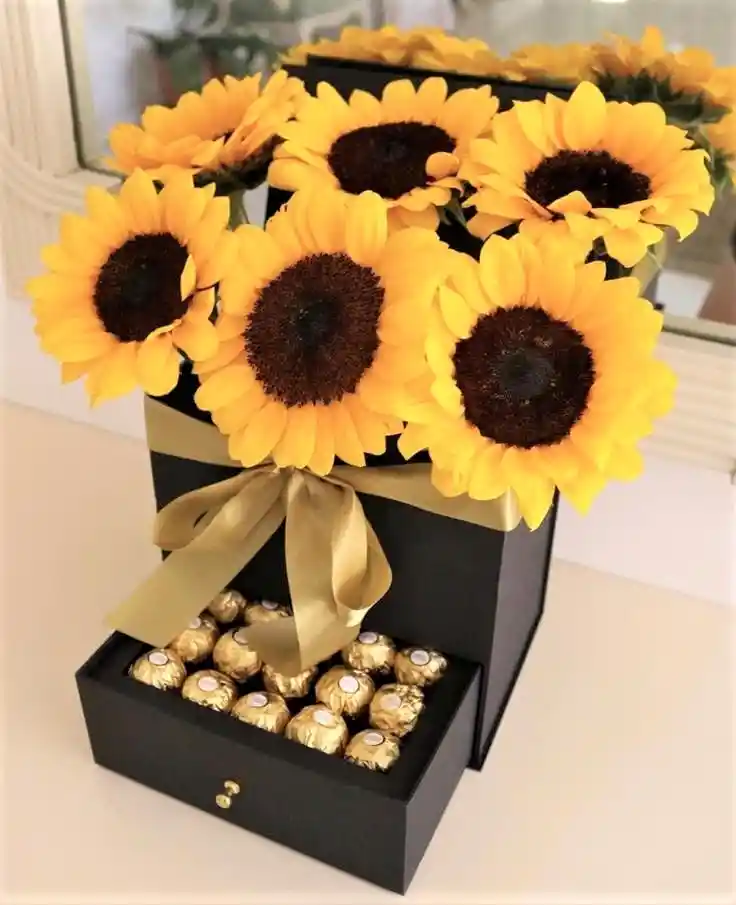 SAN VALENTIN CAJA DE 9 GIRASOLES CON MOÑO, Y 15 CHOCOLATES