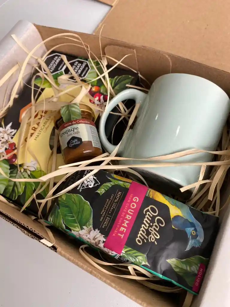 Caja de Regalo Amora Regalos contiene: 1 Caja de Caramelos Masticables de Café de Café Quindio, 1 Paquete Mini de Café Quindio de 80 Gr., 1 Frasco Mini de Arequipe Sabor a Café de Café Quindio y 1 Mug de Porcelana Color Menta Claro. En caja de cartón con decoración incluida. Ideal para regalar a mujeres y/o hombres,clientes, colaboradores, amigas, amigos, jóvenes o adultos, madres, padres, familiares.