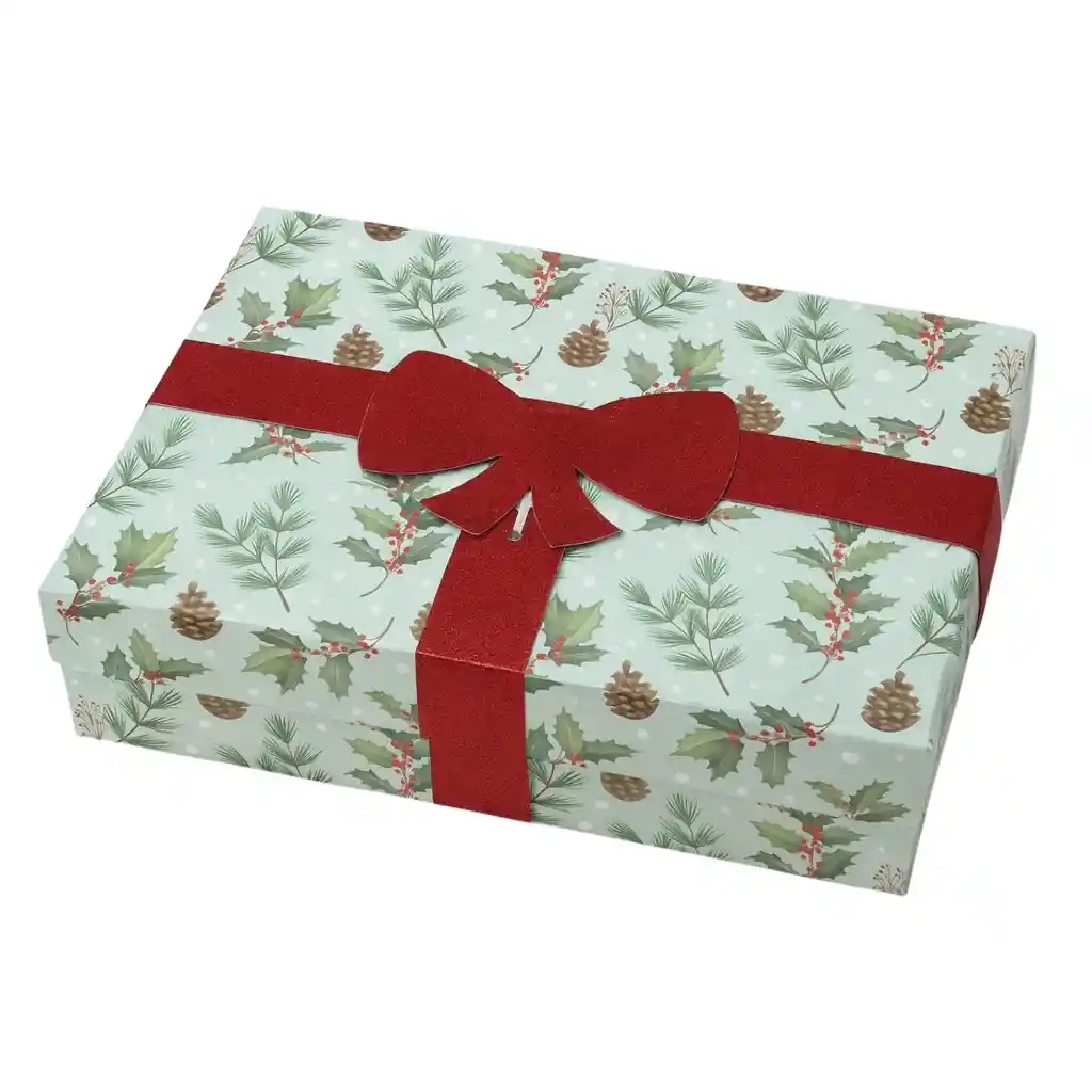 🎁 Caja de regalo navideña con encanto invernal 🎄 ✨Medidas: 36 cm ancho x 5 cm alto Haz que cada obsequio brille con esta elegante caja de regalo, envuelta en papel festivo de fondo azul celeste con ilustraciones de hojas de acebo, ramas de pino, piñas y delicados puntos blancos que evocan copos de nieve. El diseño transmite una atmósfera cálida y mágica, perfecta para la temporada navideña. ✨ Detalles que enamoran: -Papel decorativo con motivos naturales y toque nevado -Carton tipo Cinta ancha roja con acabado brillante y lazo central voluminoso -Presentación rectangular ideal para regalos medianos -Estilo clásico con aire sofisticado y festivo -Con tarjeta Ideal para envolver chocolates, accesorios, cosméticos o cualquier detalle especial que merezca una presentación inolvidable.