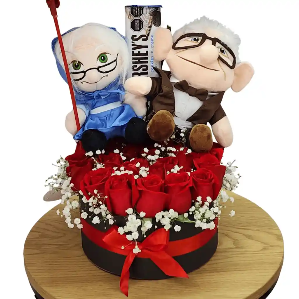 Hermoso arreglo floral en caja redonda de rosas rojas, acompañado de par de peluches viejitos y chocolate blanco Hershey's, con moño decorativo. Perfecto para toda ocasión, celebraciones especiales como San Valentín, aniversario u amor y amistad.