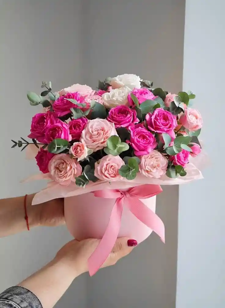 Arreglo floral en caja rosada con rosas frescas en diferentes tonos de rosa y fucsia, acompañado de follaje natural. Diseño elegante y equilibrado, ideal para regalar en cumpleaños, aniversarios o para expresar cariño y admiración. Cada flor es seleccionada por su frescura y color, garantizando una presentación delicada y duradera.