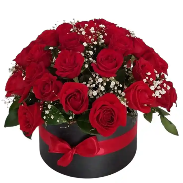 es una pieza de alta floristería que destaca por su contraste dramático y su elegancia atemporal. El arreglo presenta una cúpula densa de rosas rojas de calidad premium, seleccionadas por su color vibrante y pétalos aterciopelados, que rodean un sutil follaje de gipsofila blanca.