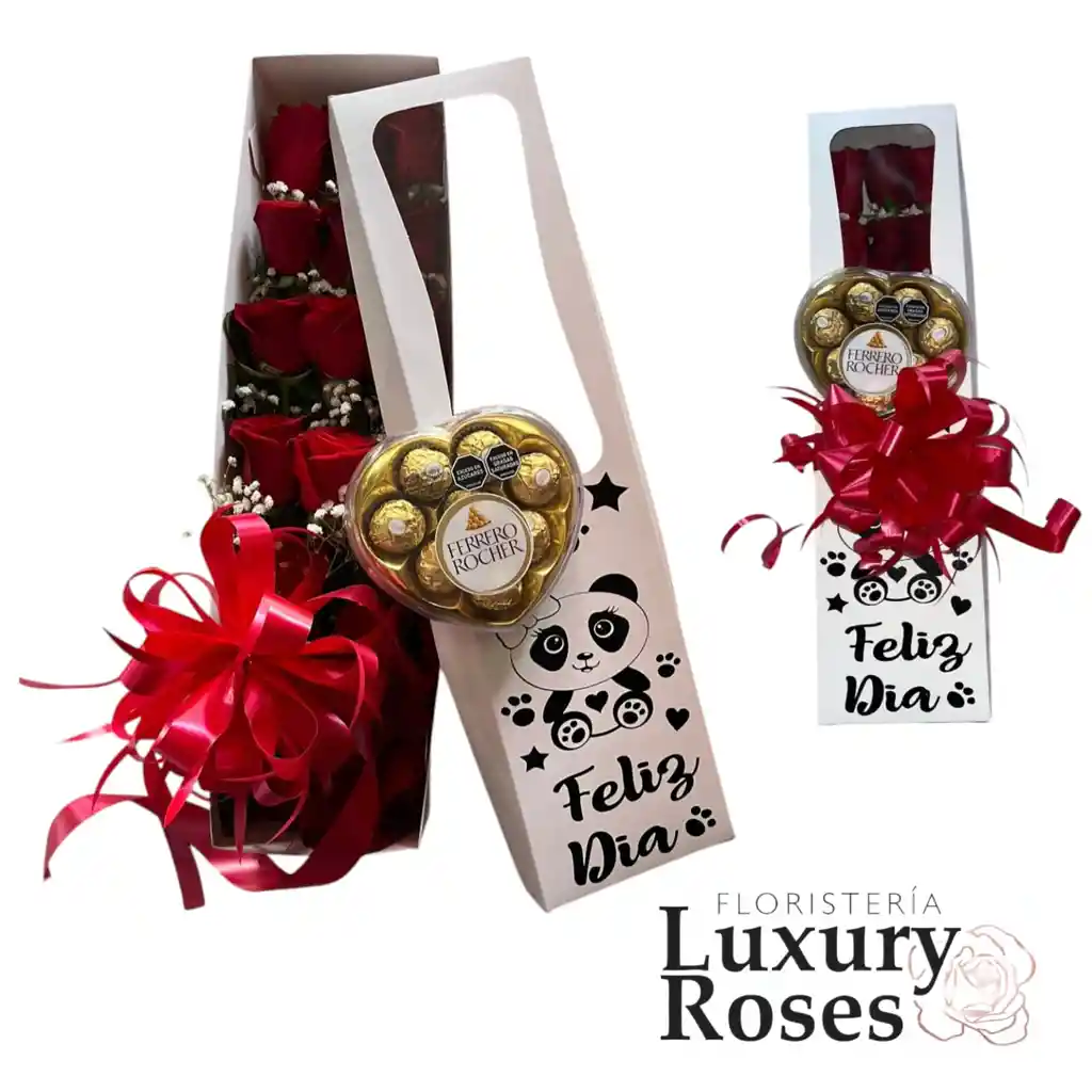 CAJA DE ROSAS ROJAS CON CHOCOLATES FOLLAJE , TENDIDO DE PETGALOS , MOÑO TARJETA CAJA