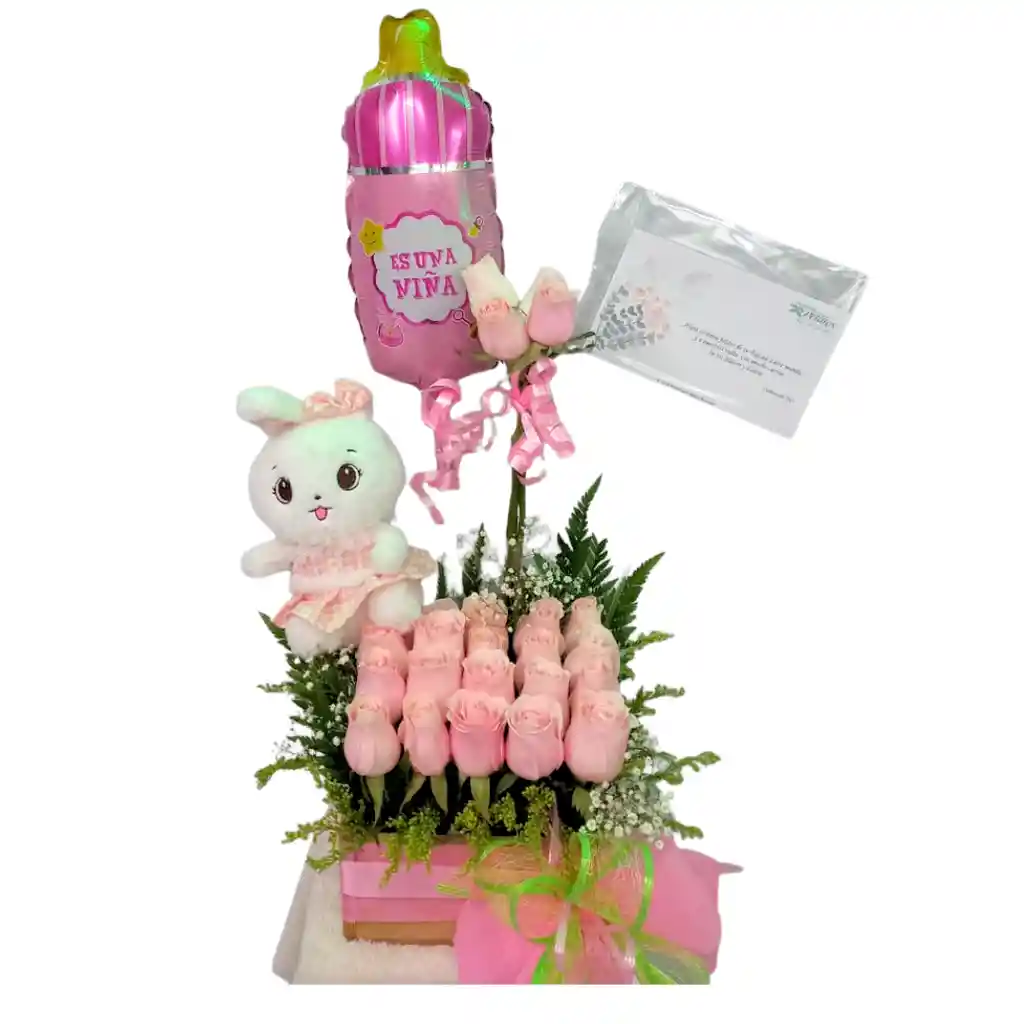 Hermoso arreglo floral en caja con rosas, peluche y globo, perfecto para recibir un bebé y felicitar la madre.