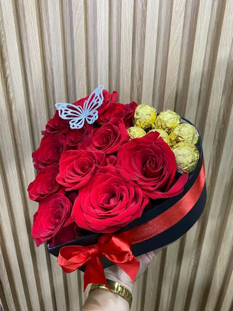 Caja con rosas y chocolates. Sorprende a tus seres queridos con este hermoso corazón. Incluye una tarjeta personalizada GRATIS.