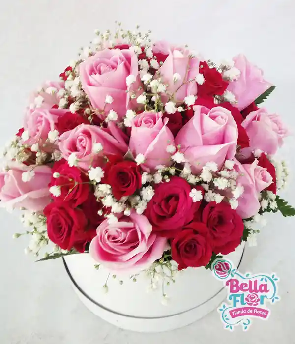 Hermosa caja de rosas en rosadas y rojas especial detalle para cautivar a las persona especial con 48 rosas