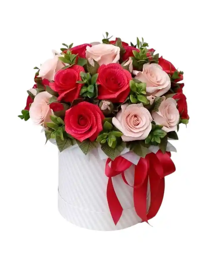 es una pieza de diseño floral que equilibra la calidez de la naturaleza con la elegancia clásica. El arreglo presenta una armoniosa combinación de rosas rojas de textura aterciopelada y rosas en tono rosa suave, dispuestas de forma compacta para crear un efecto visual de dulzura y romance.