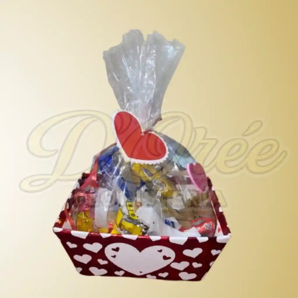 Caja decorativa con diseño de corazones que incluye una deliciosa selección de chocolates y dulces surtidos. Viene cuidadosamente envuelta en papel celofán transparente y decorada con moño elegante, lista para regalar y sorprender en cualquier ocasión especial.
