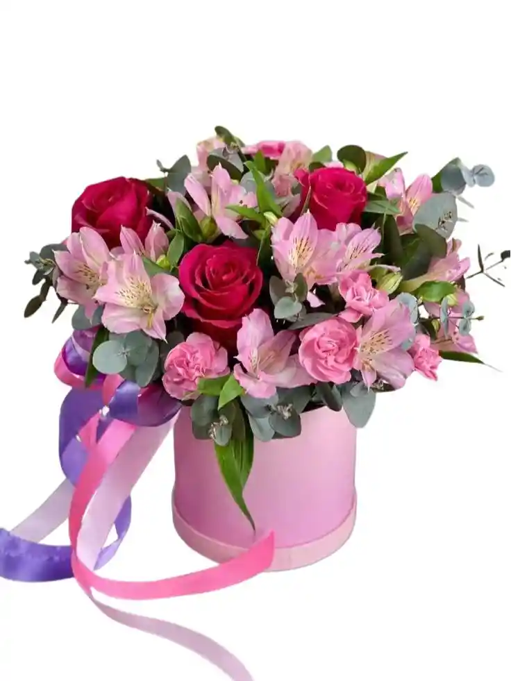 Una delicada combinación de flores con 6 rosas rojas , 1 paquete de astromelia rosada y 10 claveles rosas con eucalipto en una caja redonda, ideal para expresar afecto y elegancia con un toque de frescura y armonía. Nota: La flor puede ser sustituida dependiendo de la disponibilidad de color y del producto. "Mensaje Personalizado" máximo de 30 caracteres (Dejar el mensaje en el chat, los comentarios no se previsualizan para la tienda, por lo que si se dejan allí no podrá ser incluido).