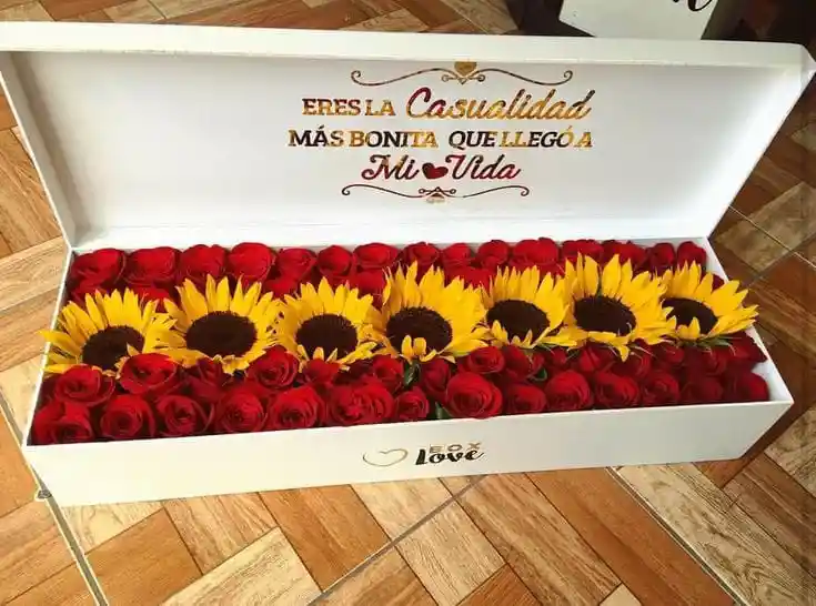 Incluye: Rosas rojas, girasoles x7, decoracion en cajas, mensaje personalizado