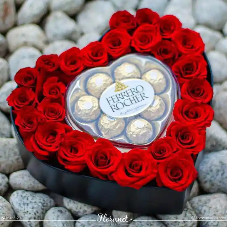 Incluye: ferrero rocher x8 forma de corazon, rosas en forma de corazon, caja en forma de corazon, decoracion, mensaje personalizado