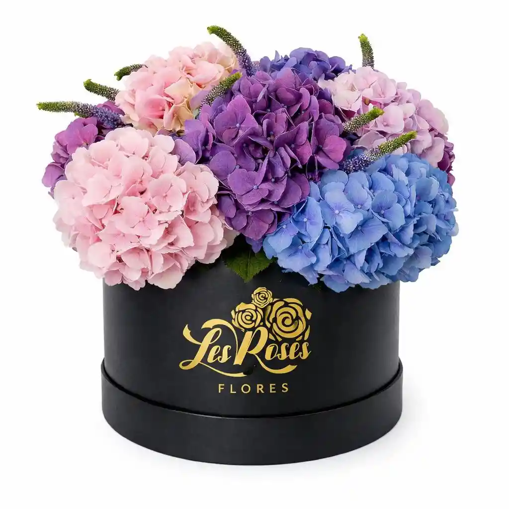 Caja floral redonda con 6 unidades de hortensias en tonos surtidos y follajes