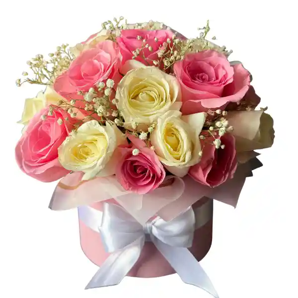 CAJA FLORAL CON ROSAS BLANCAS, ROSAS ROSADAS Y FOLLAJE