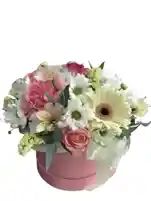 Caja de margarita con 3 gerberas blancas 10 claveles entre rosados y blancos 6 rosas rosadas medio paquete de margarita blanca y medio paquete de astroemlia rosada con 3 varas de eucalipto Nota: La flor puede ser sustituida dependiendo la disponibilidad de color y del producto “Mensaje Personalizado” máximo de 30 caracteres (Dejar el mensaje en el chat, los comentarios no se previsualizan para la tienda por lo que si se dejan allí no podrá ser incluido).