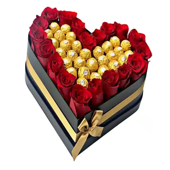 CAJA NEGRA DE LUJO 20 ROSAS, 24 CHOCOLATES FERRERO ROCHER, LAZO DORADO.