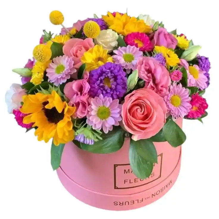 presenta una armoniosa mezcla de girasoles radiantes, rosas en tonos rosados suaves, crisantemos coloridos y craspedia amarilla para un toque lúdico y moderno. Todo dispuesto artísticamente en una elegante caja circular rosa pastel, ideal para regalar vitalidad, celebrar cumpleaños o simplemente alegrarle el día a alguien especial.