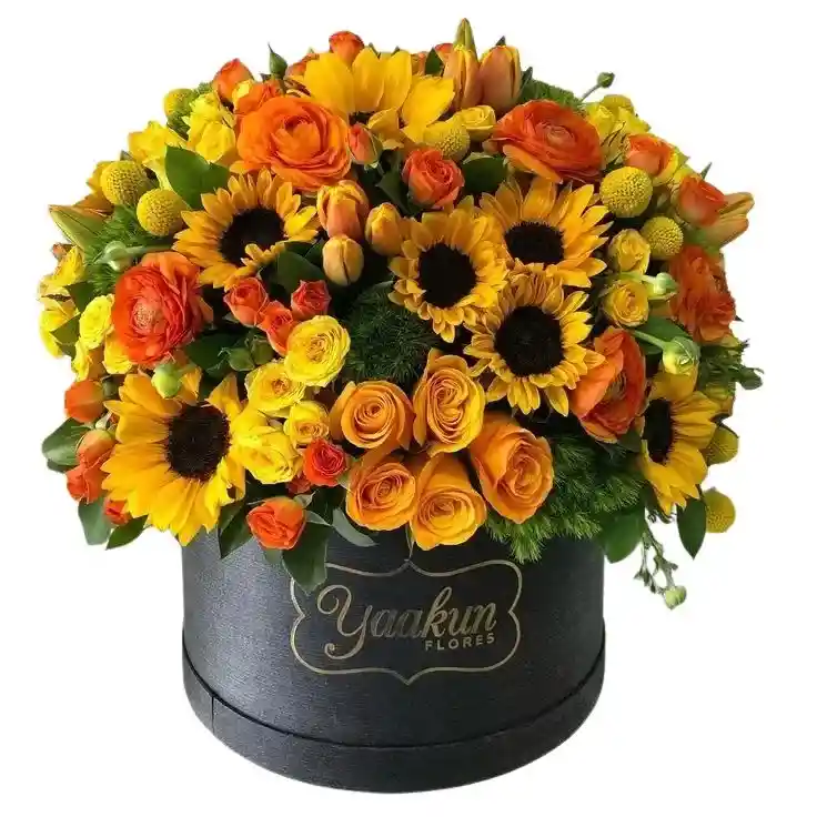 Caja grande naranja de 30 rosas entre naranjas y amarillas , 15 girasoles y 7 varas de lirios naranjas con rusco Nota: La flor puede ser sustituida dependiendo la disponibilidad de color y del producto “Mensaje Personalizado” máximo de 30 caracteres (Dejar el mensaje en el chat, los comentarios no se previsualizan para la tienda por lo que si se dejan allí no podrá ser incluido).