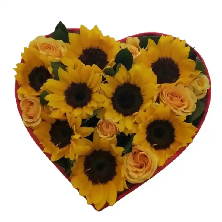 Caja de corazón de girasoles y rosas amarillas Una espectacular caja en forma de corazón que combina la energía del girasol con la calidez de las rosas amarillas, perfecta para transmitir alegría y positividad. Nota: La flor puede ser sustituida dependiendo de la disponibilidad de color y del producto. "Mensaje Personalizado" máximo de 30 caracteres (Dejar el mensaje en el chat, los comentarios no se previsualizan para la tienda, por lo que si se dejan allí no podrá ser incluido).